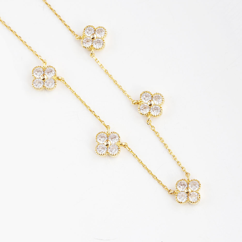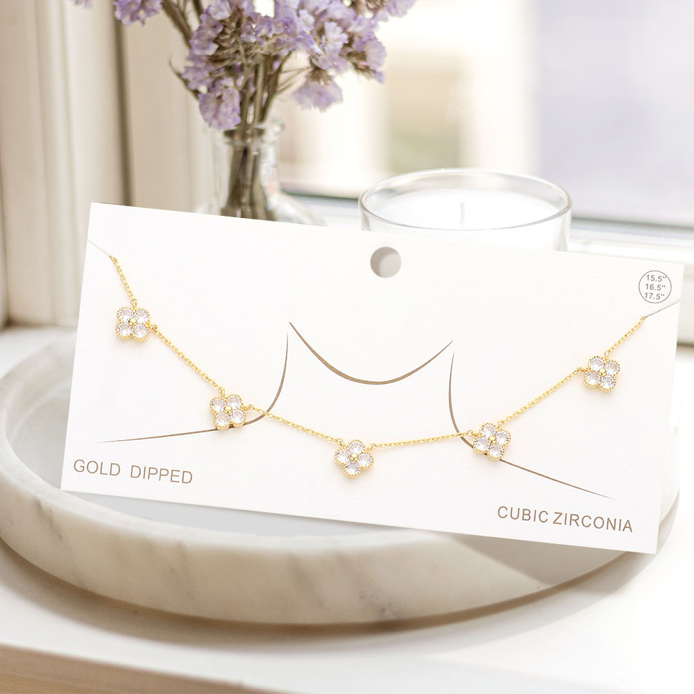 Details • Necklace Size : 15.5" + 1" L • Pendant Size : 0.5" X 0.5" • This charming quatrefoil link necklace features delicate floral charms evenly spaced along a fine chain. Designed for elegance and everyday wear, it adds a soft, feminine touch to any outfit, perfect for layering or as a subtle statement piece. • Lead and Nickel Compliant • Made In Korea • Gold Dipped • CZ Cubic Zirconia