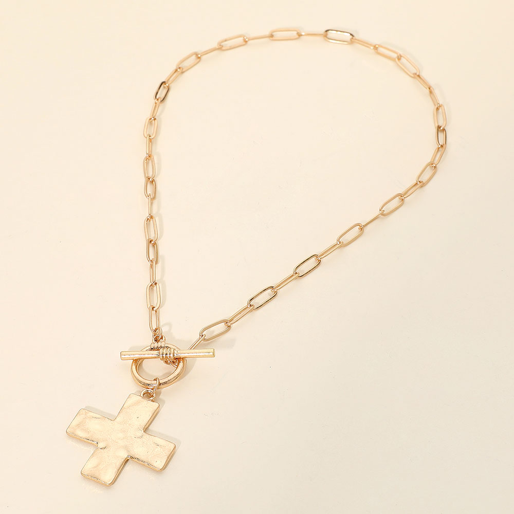 Details • Necklace Size : 17.5" L • Pendant Size : 1.25" X 1.25" • Toggle Closure • Elegant hammered cross pendant necklace with a sleek chain and toggle clasp. Perfect for layering or wearing solo, this modern piece blends timeless symbolism with contemporary design. • Lead and Nickel Compliant