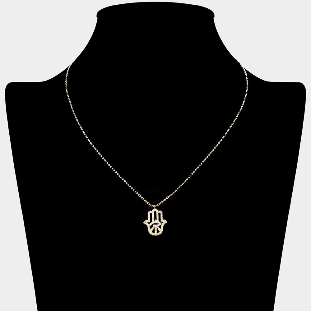 Details • Necklace Size : 16.5" + 2" L • Pendant Size : 0.6" X 0.75" • Dainty Hamsa hand pendant necklace featuring a sparkle-accented openwork charm on a delicate chain. A meaningful, stylish accessory symbolizing protection and positivity, perfect for layering or gifting. • Gold Dipped • CZ Cubic Zirconia