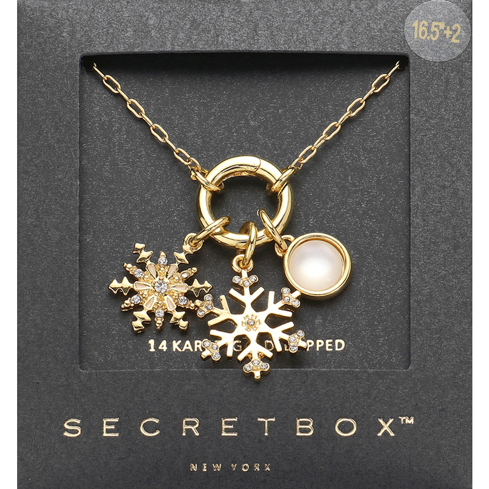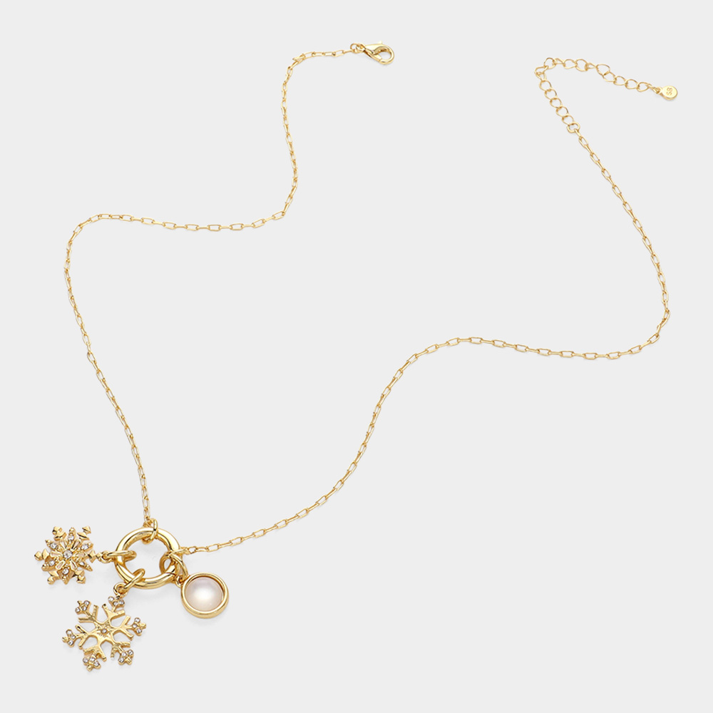 Details • Necklace Size : 16.5" + 2" L • Pendant Size : 1" X 1.25" • A charming necklace featuring two detailed snowflake charms paired with a small round pendant for a balanced, festive design. Perfect for seasonal styling, daily wear, or gifting, it adds a touch of winter-inspired elegance and sparkle to any outfit. • Gold Dipped