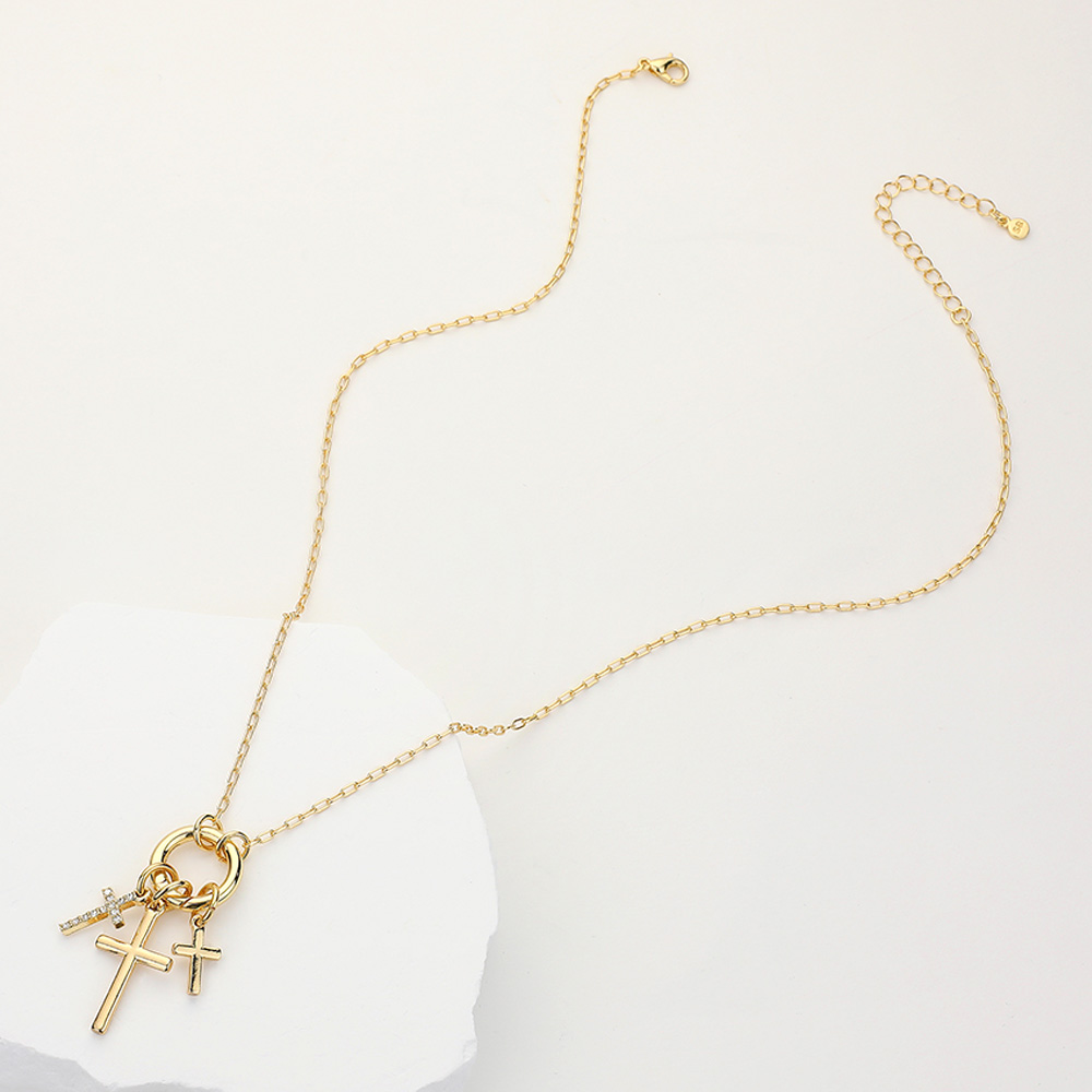 Details • Necklace Size : 16.5" + 2" L • Decor Size : 0.6" X 1.6" • A striking necklace featuring three cross pendants in varied sizes and finishes, creating a layered, meaningful statement. The bold charm cluster adds dimension and style, making it perfect for daily wear, gifting, or pairing with other pieces for a standout modern look. • Gold Dipped