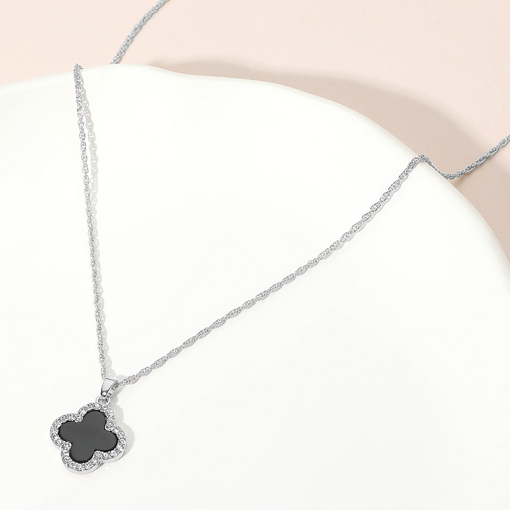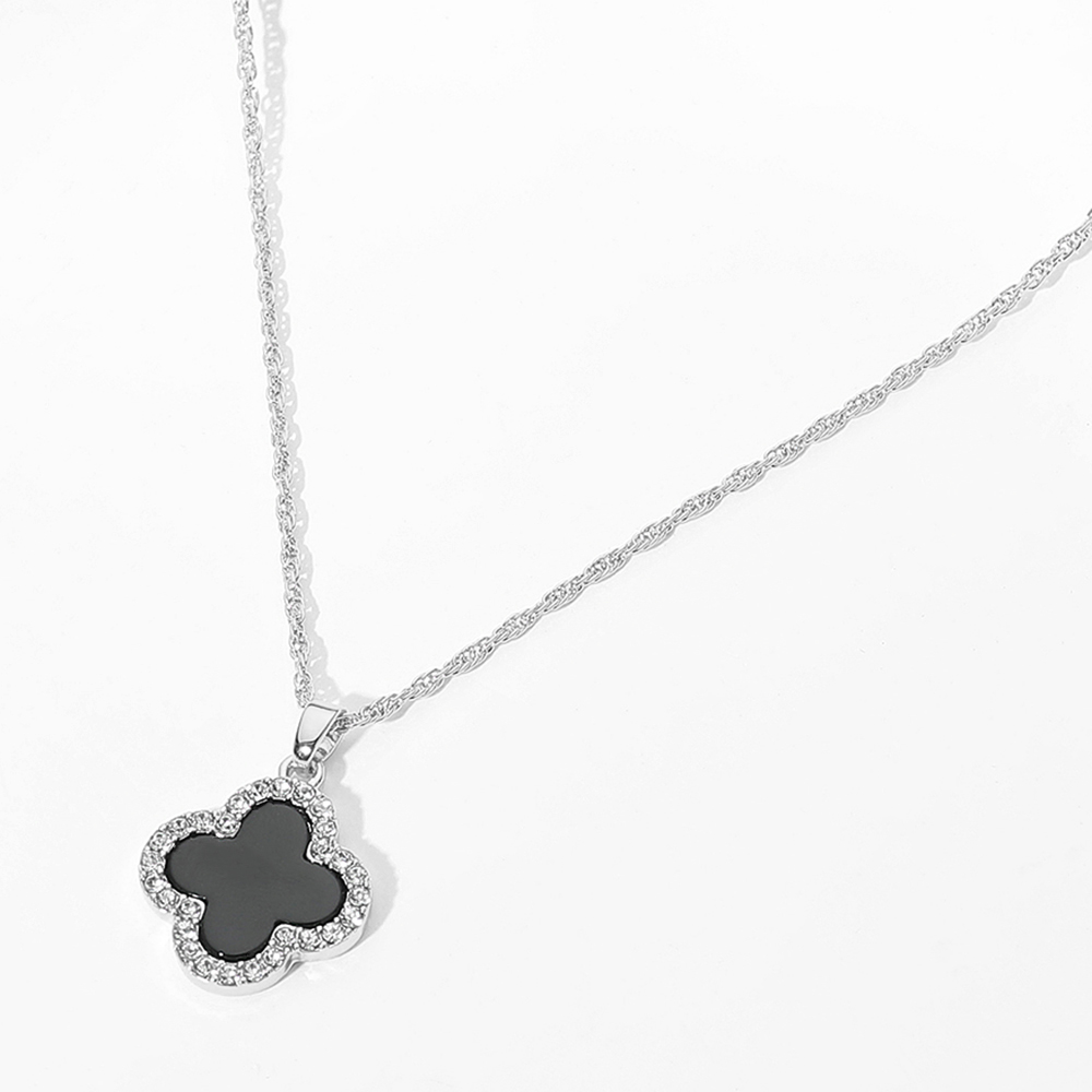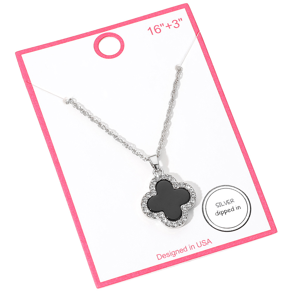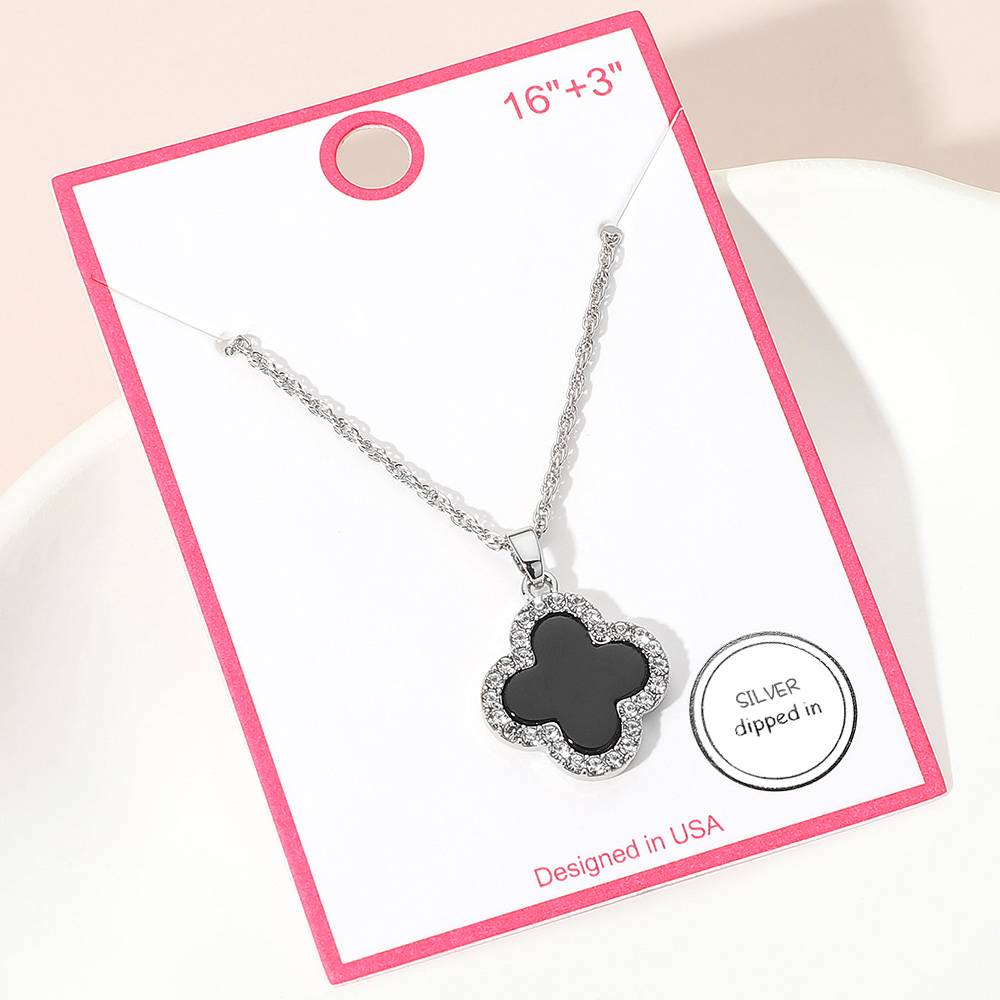 Details • Necklace Size : 16" + 3" L • Pendant Size: 0.75" X 1" • This radiant quatrefoil outline pendant necklace features a hollow design surrounded by shimmering stones for a touch of elegance. Its delicate chain and timeless silhouette create a versatile accessory that complements both everyday wear and special occasions with effortless charm. • Sterling Silver Dipped • Lead and Nickel Compliant