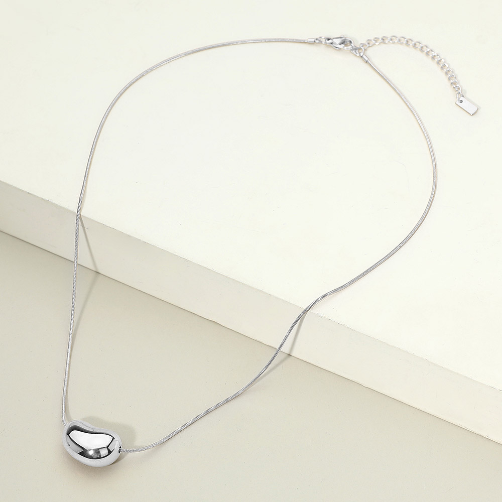 Details • Necklace Size : 16" + 2" L • Pendant Size : 0.7" X 0.5" • This stainless steel necklace highlights a smooth bean-shaped pendant on a fine chain, blending modern simplicity with artistic flair. Its polished finish adds refined elegance, making it a versatile accessory that complements both everyday and sophisticated styles effortlessly. • Stainless Steel