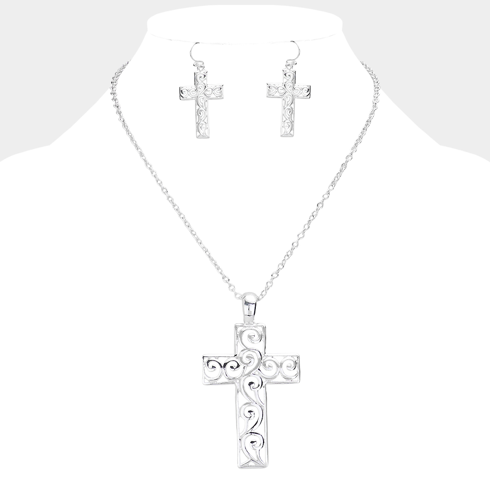 Hammered Metal Stone Paved Heart Cross Pendant Pointed Triple Layered Necklace