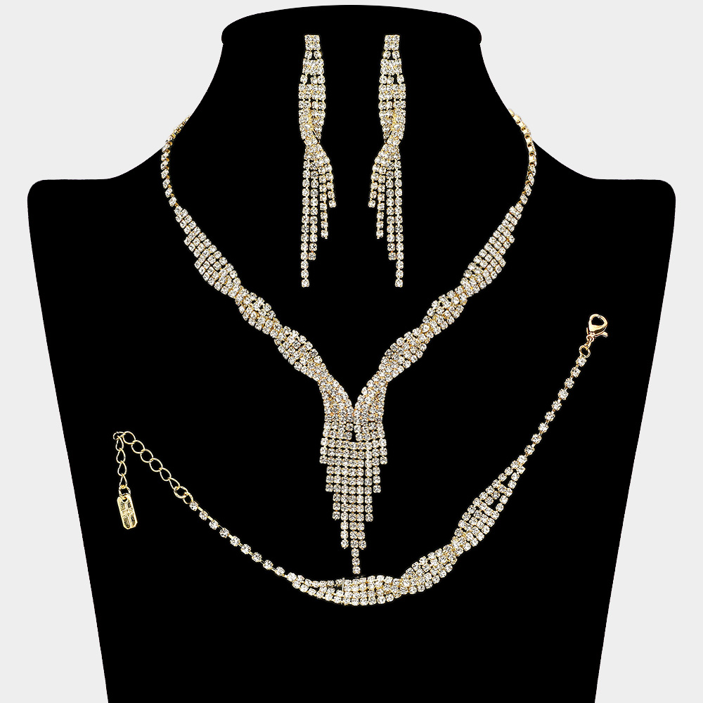 Details • Necklace Size : 16" + 4" L • Decor Size : 2" L • Bracelet Size : 0.3" H, 7" + 2" L • Earrings Size : 2.75" L • 3-Pieces Jewelry Set • Elevate your evening style with this luxurious gold-tone crystal jewelry set. Featuring a dazzling necklace, matching bracelet, and elegant drop earrings, this set adds timeless sparkle to weddings, proms, and formal occasions. Perfect for creating a glamorous and coordinated look.