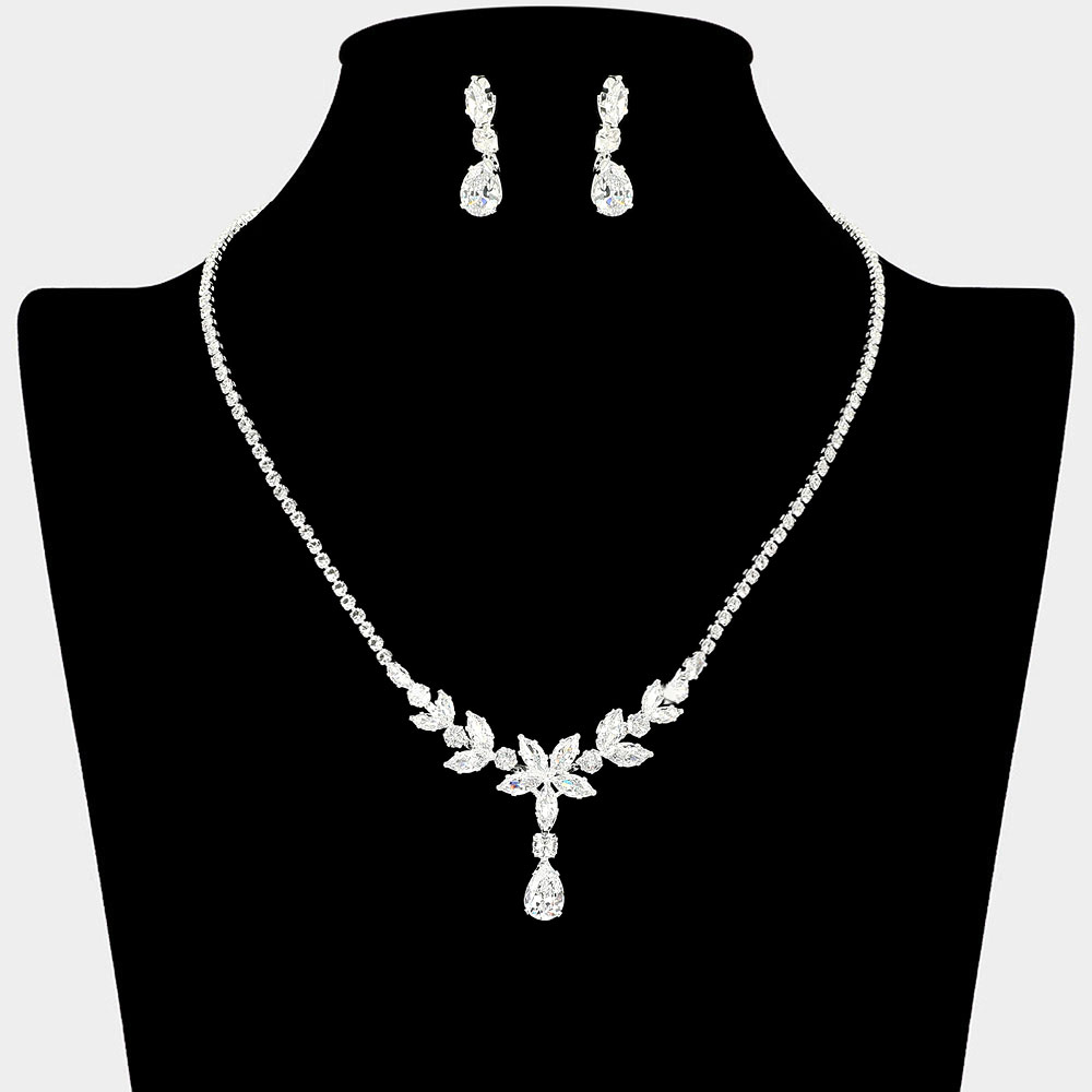 Details • Necklace Size : 16" + 4" L • Decor Size : 1.4" L • Earrings Size : 1" L • This elegant floral crystal jewelry set features a stunning necklace and matching earrings adorned with brilliant teardrop accents. Perfect for weddings, evening events, or formal occasions, the intricate floral design radiates timeless glamour and sophisticated brilliance in every detail. • CZ Cubic Zirconia