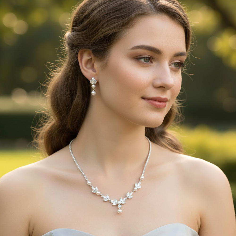 Details • Necklace Size : 17.5" + 4.25" • Decor Size : 0.9" L • Earrings Size : 1" L • Add refined charm to any formal look with this delicate jewelry set featuring a graceful arrangement of sparkling accents and classic pearl drops. The matching earrings and necklace bring a polished finish to bridal styles, evening wear, and special celebrations, creating a timeless, graceful impression. • CZ Cubic Zirconia • Lead and Nickel Compliant