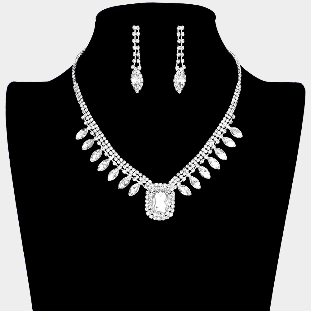 • Shine with sophistication in this rhinestone rectangle pendant necklace and earrings set. Featuring a bold center pendant with teardrop accents, this dazzling jewelry is perfect for weddings, proms, galas, and formal occasions, adding elegance and brilliance to any evening or special event look.