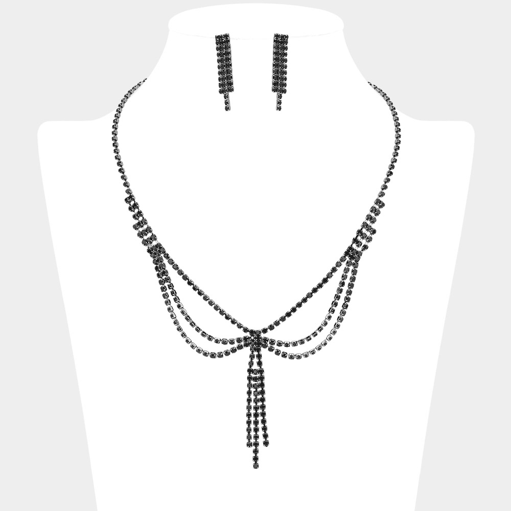 Details • Necklace Size : 16.5" + 4" L • Decor Size : 2.4" L • Earrings Size : 1.25" L • Elegant layered necklace and earring set featuring cascading rhinestone strands and a center tassel accent. The draped silhouette adds graceful movement, perfect for formal events, evening wear, or stylish special occasions. • Lead and Nickel Compliant