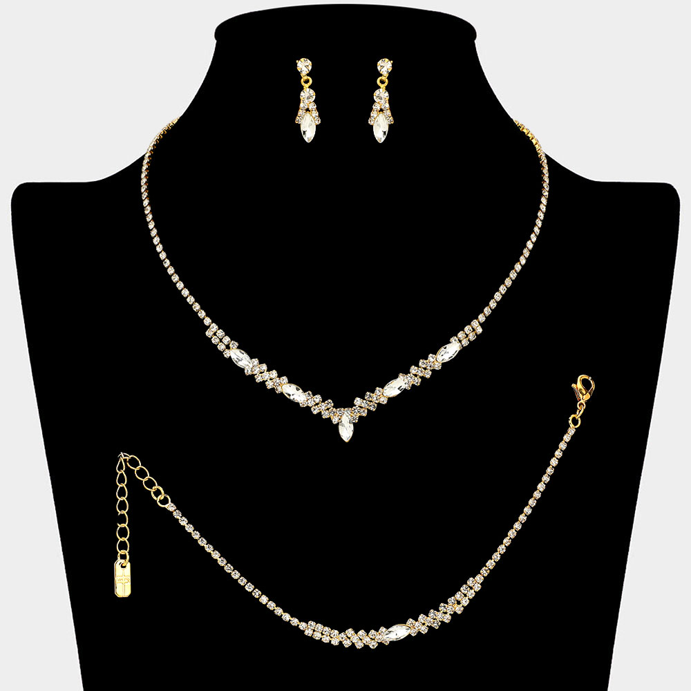 Details • Necklace Size : 14.5" + 4" L • Decor Size : 0.4" L • Bracelet Size : 0.25" H, 7" + 2" L • Earrings Size : 1" L • Shine with timeless elegance in this crystal jewelry set featuring a delicate necklace, matching bracelet, and sparkling drop earrings. Designed with refined detailing, it adds a graceful touch to formal looks, perfect for weddings, galas, or special evening occasions.