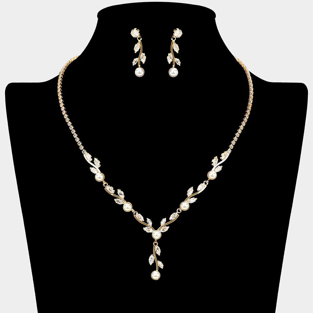 Details • Necklace Size : 16" + 4" L • Decor Size : 1.25" L • Earrings Size : 1.25" L • This pearl leaf jewelry set combines timeless beauty with refined sparkle. Featuring a delicate necklace and matching earrings adorned with pearls and crystal leaf motifs, it adds sophistication and grace to any outfit—ideal for weddings, galas, or formal celebrations. • CZ Cubic Zirconia