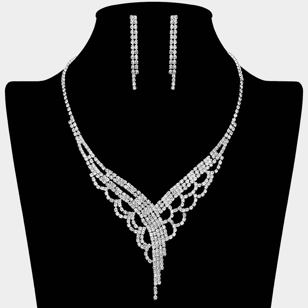 Details • Necklace Size : 15" + 5.25" L • Decor Size : 2.25" L • Earrings Size : 1.8" L • Dazzling statement jewelry set featuring a crystal-embellished layered necklace with cascading detail and matching drop earrings. Perfect for weddings, galas, and formal occasions, this elegant design adds radiant sparkle and refined glamour to any special event look. • Lead and Nickel Compliant