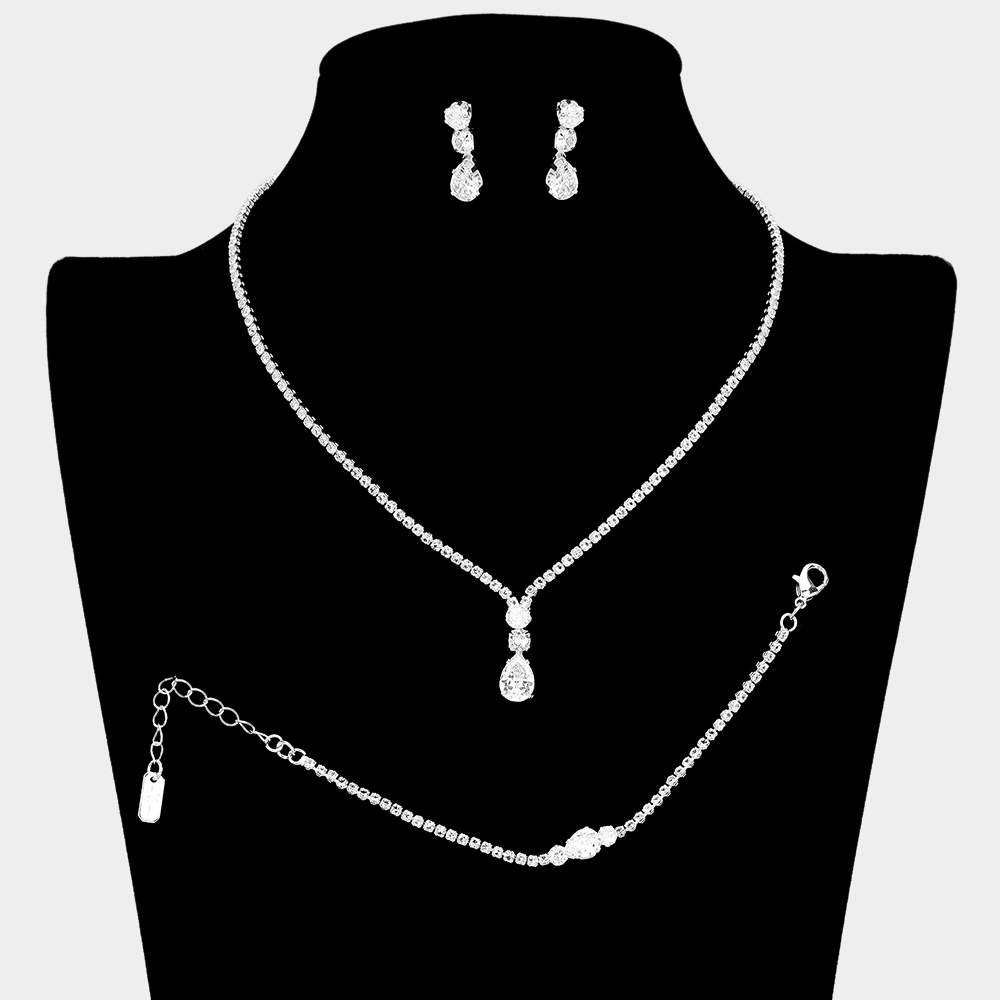 Details • Necklace Size : 14.25" + 4" L • Decor Size : 0.8" L • Bracelet Size : 0.25" H, 5.5" + 2" L • Earrings Size : 0.8" L • This elegant bridal jewelry set includes a teardrop pendant necklace, matching earrings, and a delicate bracelet. Designed to elevate wedding attire and formal looks, it brings refined sparkle and timeless charm, making it an ideal choice for brides, bridesmaids, and special celebrations. • CZ Cubic Zirconia • Lead and Nickel Compliant
