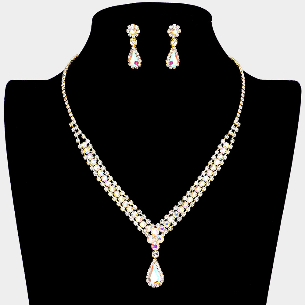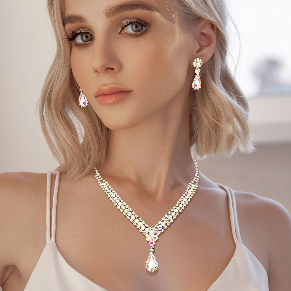 Details • Necklace Size : 15.5" + 4" L • Decor Size : 1.5" L • Earring Size : 1.2" L • Elevate your evening look with this sparkling rhinestone necklace and matching earrings set. Featuring a radiant teardrop pendant and shimmering crystals, this set is perfect for weddings, parties, and special occasions, adding timeless elegance to any outfit.