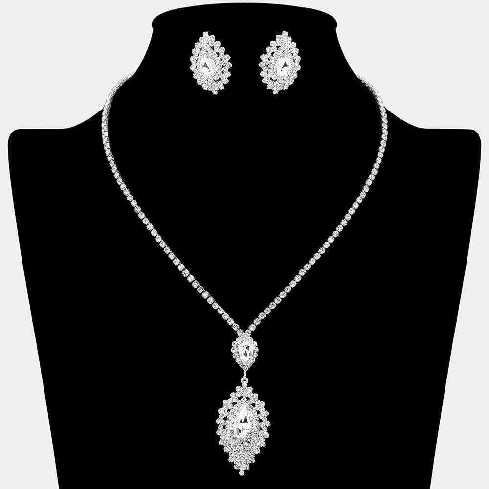 • Elegant teardrop crystal necklace with matching earrings featuring a double halo design and sparkling accents. A refined jewelry set ideal for weddings, proms, evening events, or adding sophistication to formal looks.