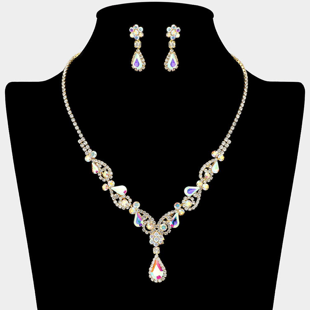 Details • Necklace Size : 16" + 4" L • Decor Size : 1.5" L • Earrings Size : 1.2" L • Dazzle with this iridescent teardrop necklace and earring set, featuring a radiant display of shimmering stones and intricate detailing. Perfect for special occasions or evening wear, this elegant jewelry set adds a touch of glamour and brilliance to any sophisticated ensemble.