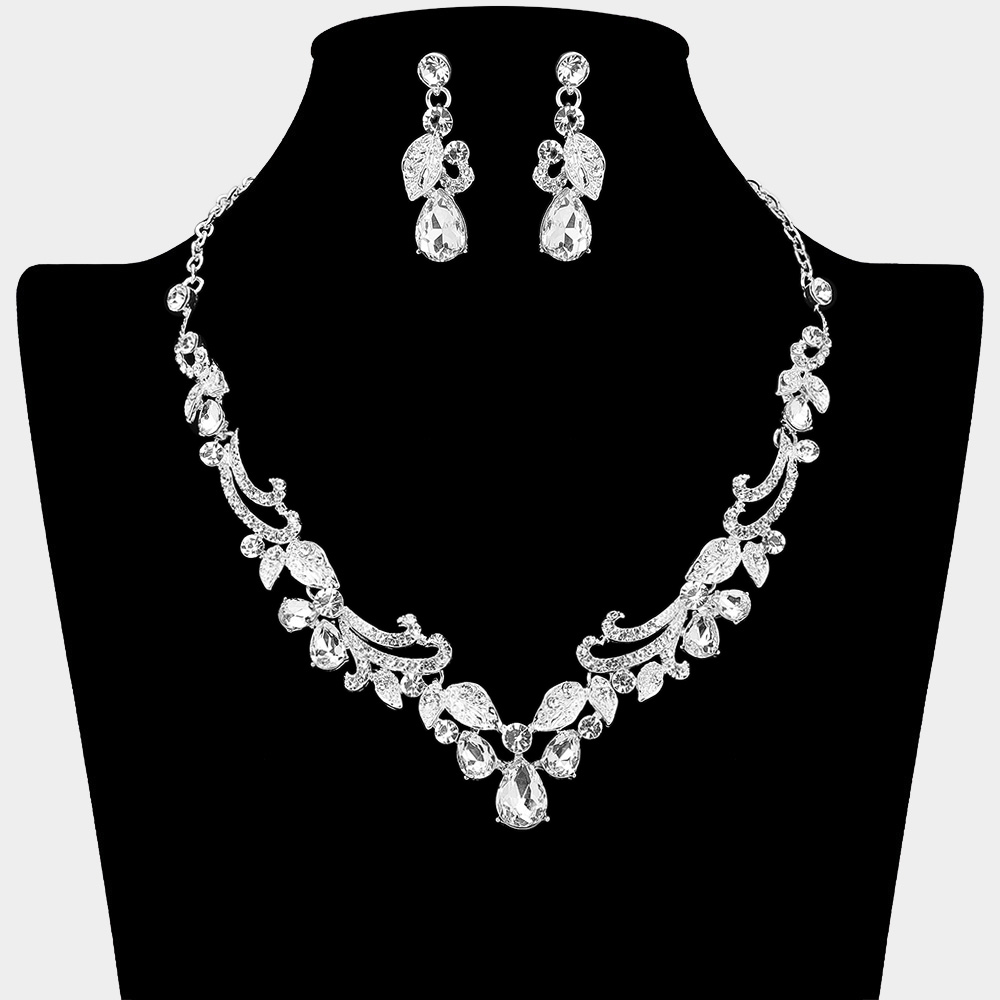 • Dazzling necklace and earring set featuring teardrop crystals with intricate leaf accents. Perfect for weddings, pageants, or evening events, this set adds a refined and elegant touch to any special occasion look.