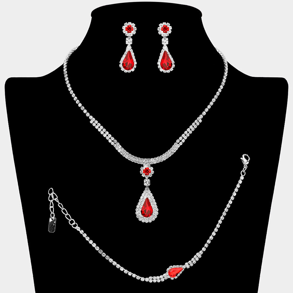 Details • Necklace Size : 16" + 4" L • Decor Size : 1.6" L • Bracelet Size : 0.4" H, 7" + 2" L • Earrings Size : 1.3" L • Enhance your special occasion look with this teardrop crystal necklace, bracelet, and earring set. Featuring a radiant drop pendant and dazzling crystal accents, this timeless jewelry ensemble exudes sophistication, making it perfect for brides, galas, and formal evening events.