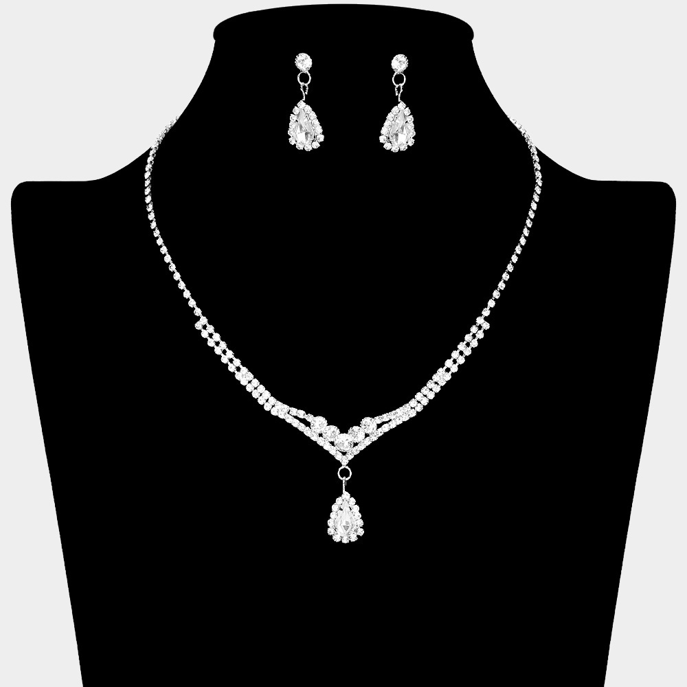 • Sophisticated teardrop jewelry set featuring a dazzling necklace and matching earrings. Designed with sparkling stones and a refined drop centerpiece, this elegant set enhances any bridal, prom, or formal look with timeless beauty and radiant charm, perfect for special celebrations.
