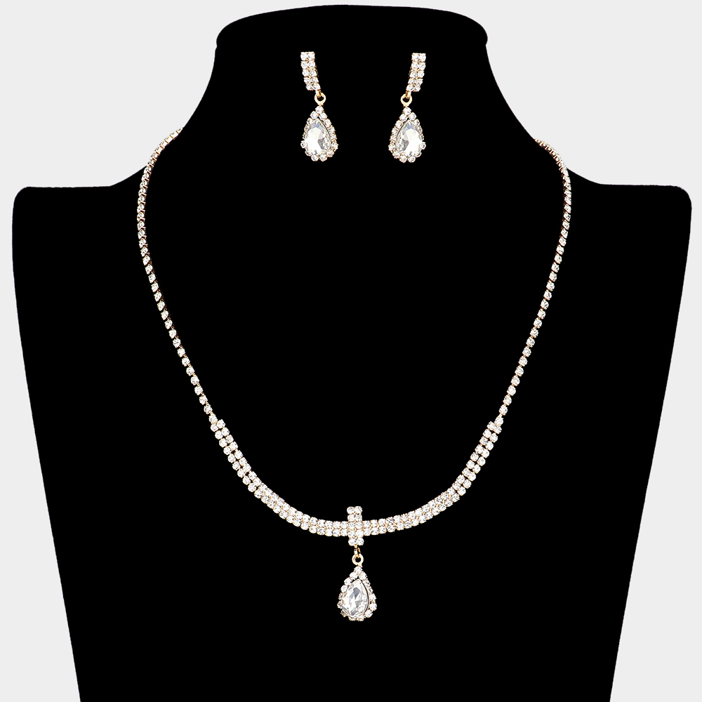Details • Necklace Size : 17" + 5" L • Decor Size : 1.25" L • Earrings Size : 1.25" L • Chic jewelry set featuring a delicate necklace with a teardrop pendant and matching earrings. Adorned with shimmering stones for a timeless shine, this elegant set is perfect for brides, evening parties, or formal occasions, adding refined sophistication and radiant sparkle to any outfit. • Lead and Nickel Compliant