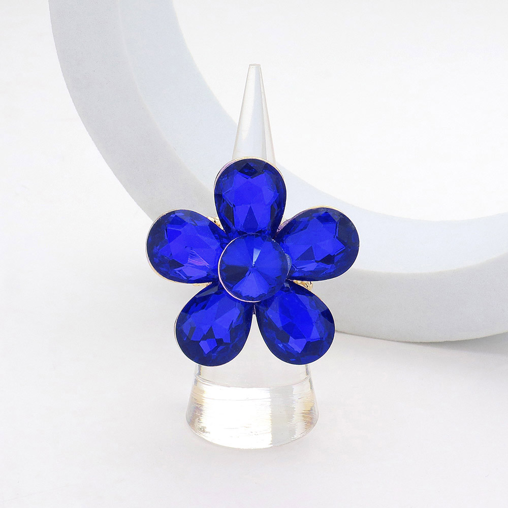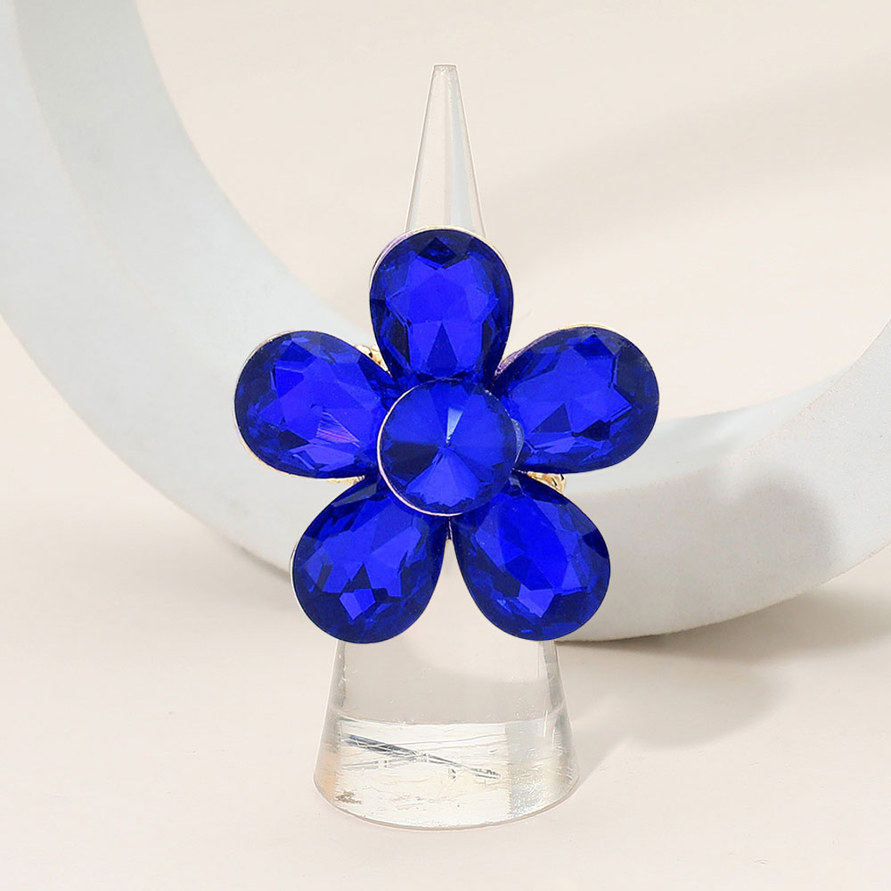 Details • Size : 1.5" H • Stretchable • Elegant flower-shaped statement ring featuring a dazzling faceted petal design that catches the light beautifully. Perfect for adding a bold, eye-catching accent to any outfit, this gem-inspired accessory enhances your style with its unique shape and sparkling radiance. • Lead and Nickel Compliant