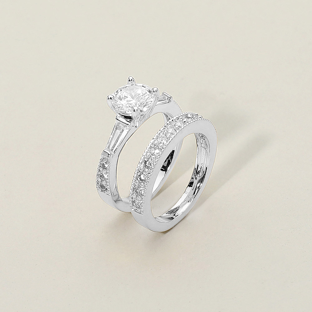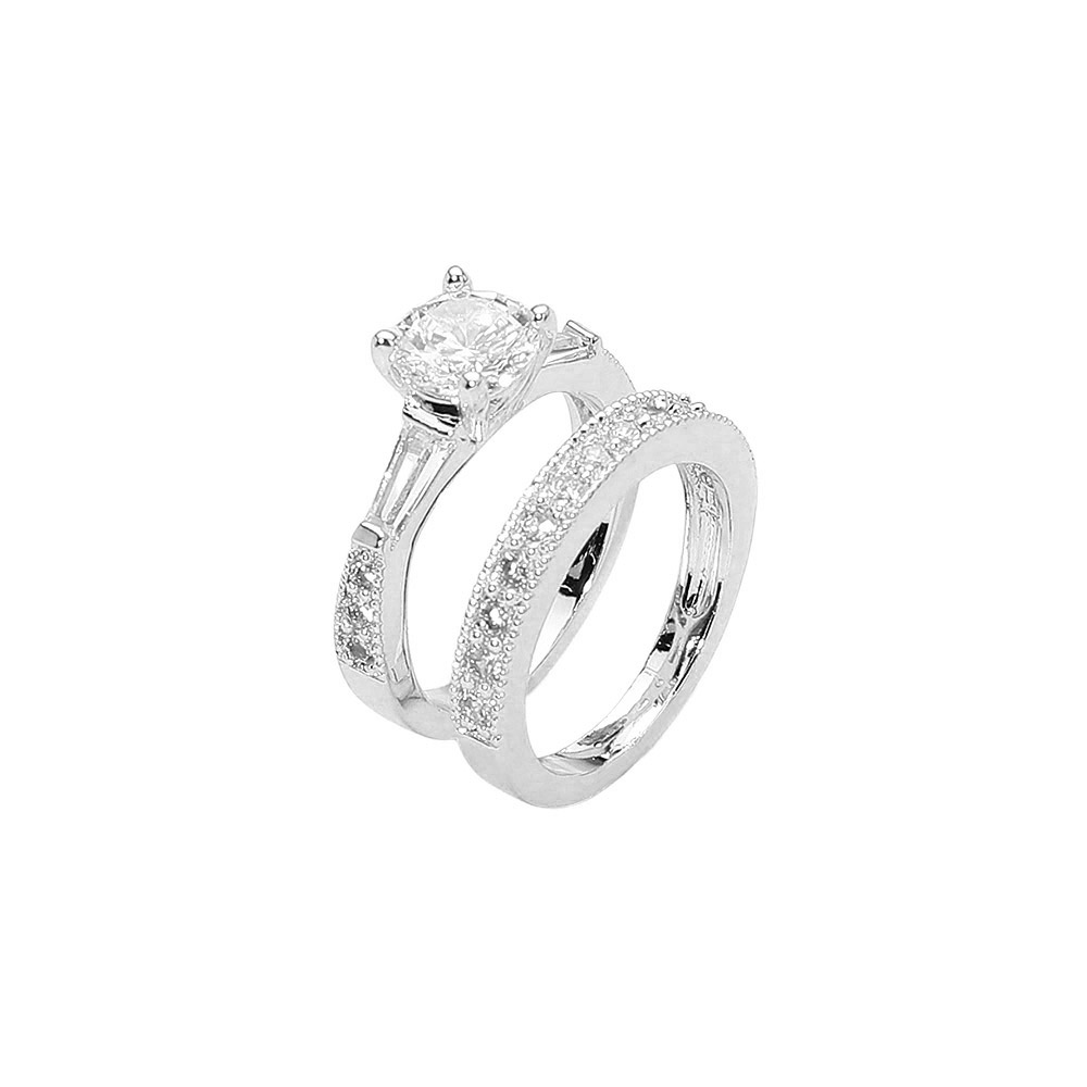 Details • Size : 0.2" - 0.25" H • Elegant two piece ring set featuring a round cut cubic zirconia centerpiece complemented by a matching band adorned with shimmering pave accents. A timeless and refined design perfect for engagements, weddings, or adding sophisticated sparkle to everyday looks. • CZ Cubic Zirconia