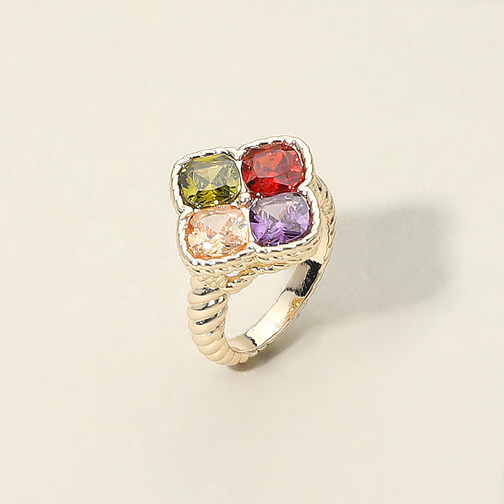• Elegant ring showcasing a square cluster design with four faceted cz gemstones set in a raised border. The textured band adds a refined touch, making this geometric ring a standout accessory that balances color, form, and sophistication for any outfit or occasion.