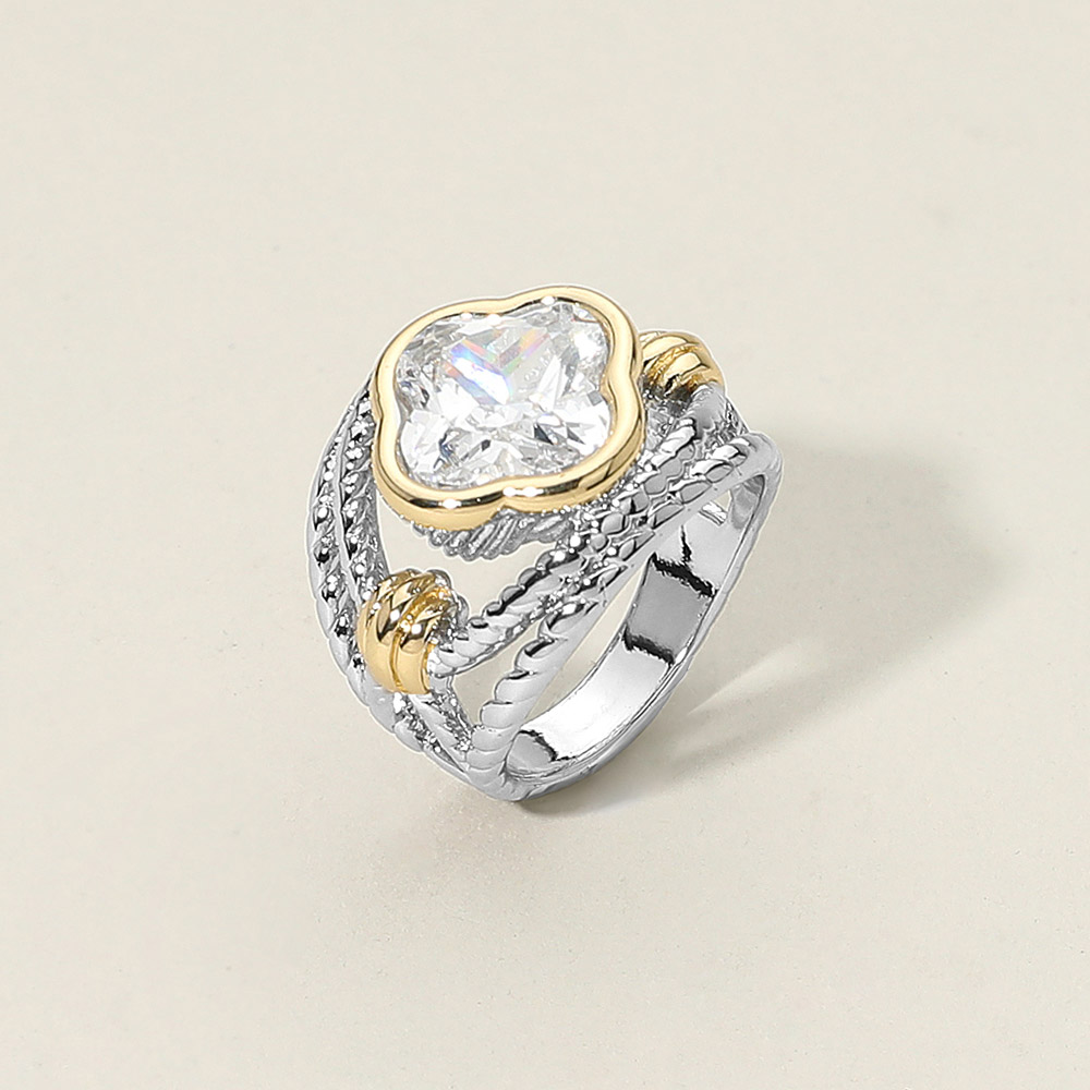 Details • Size : 0.75" H • Elegant ring featuring a shimmering quatrefoil-shaped center cz stone set within a detailed two-tone band. Its intricate design and refined sparkle make it a standout accessory, perfect for adding a touch of sophistication to both special occasions and everyday style. • CZ Cubic Zirconia