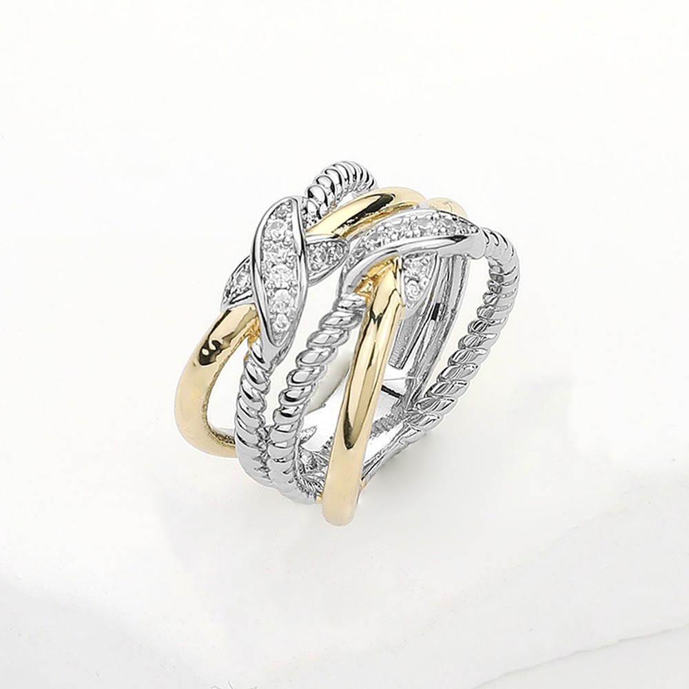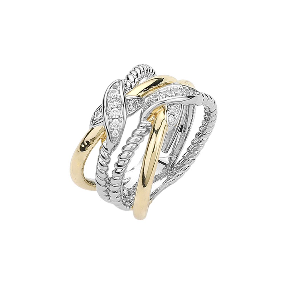 Two Tone CZ Stone Paved Crisscross Pointed Ring