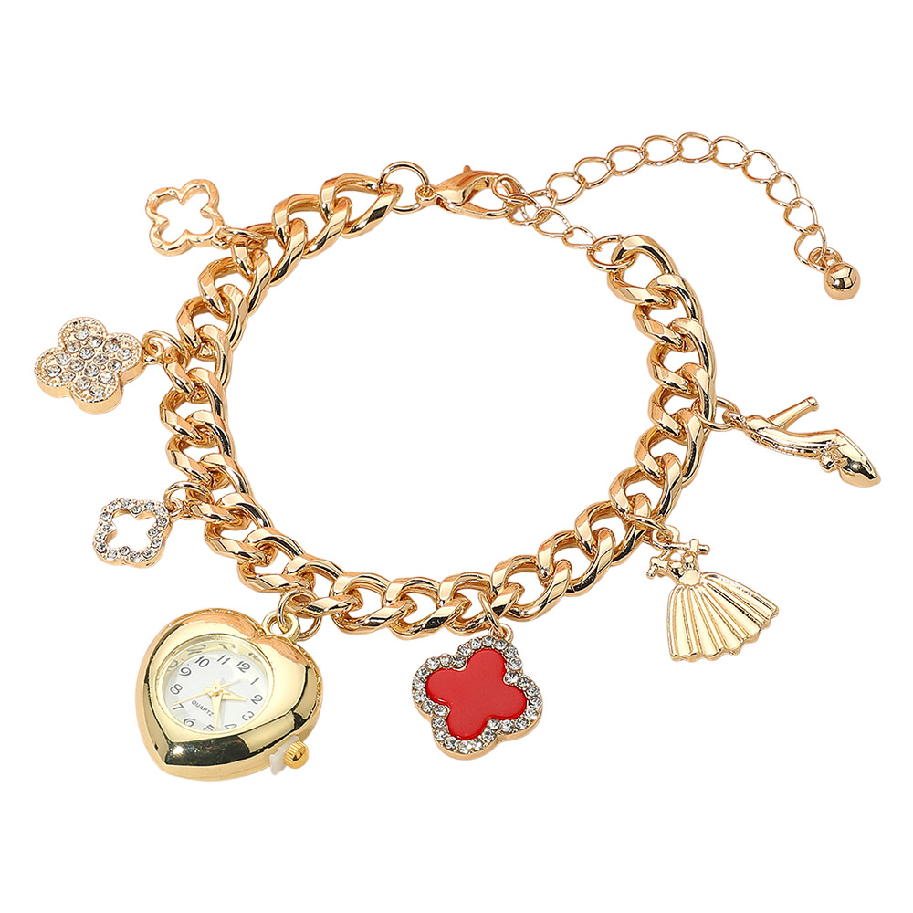 Details • Size : 0.4" H, 7.5" + 3" L • Charm Size : 1" L • Lobster Clasp Closure • Elevate your accessory collection with this heart charm bracelet watch. Designed with a polished chain and adorned with elegant charms, it combines fashion and function in one piece. Perfect for adding a touch of sparkle and sophistication to any casual or dressy outfit. • Lead and Nickel Compliant • Gold Dipped