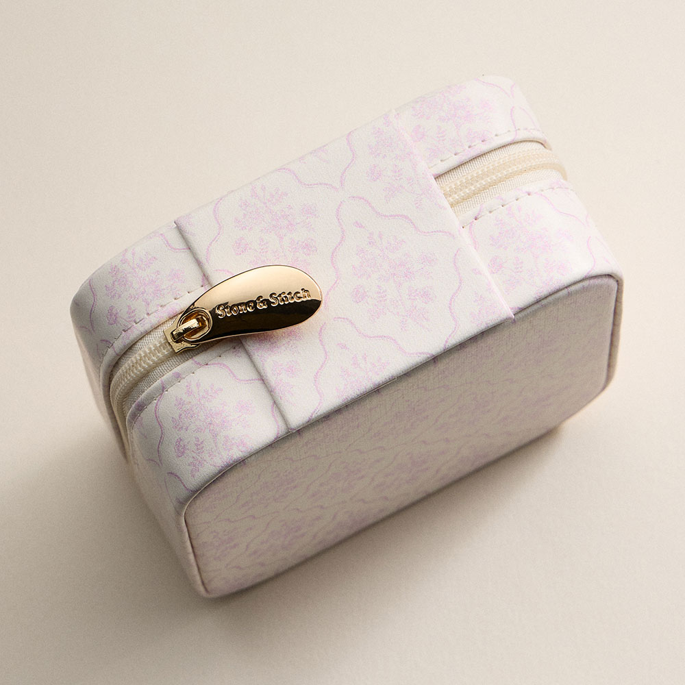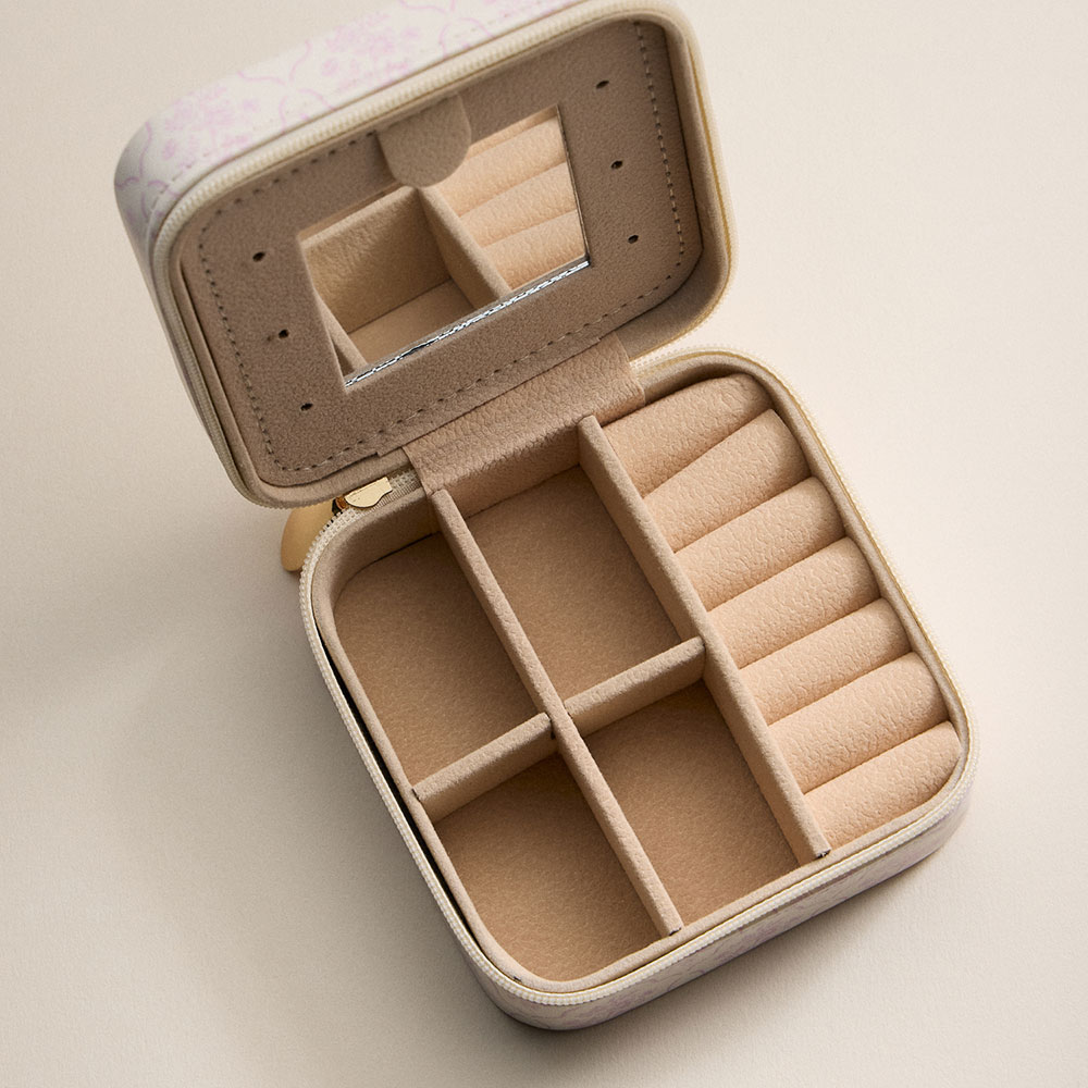 Details • Size : 3.75" X 3.75" X 1.75" • Zipper Closure • Keep your favorite jewelry organized and protected on the go with this compact travel case featuring multiple divided compartments, secure ring slots, and a built-in mirror for quick accessorizing. The elegant floral pattern adds a stylish touch, while the zip closure ensures pieces stay safe. Perfect for trips, daily storage, or gifting to jewelry lovers.