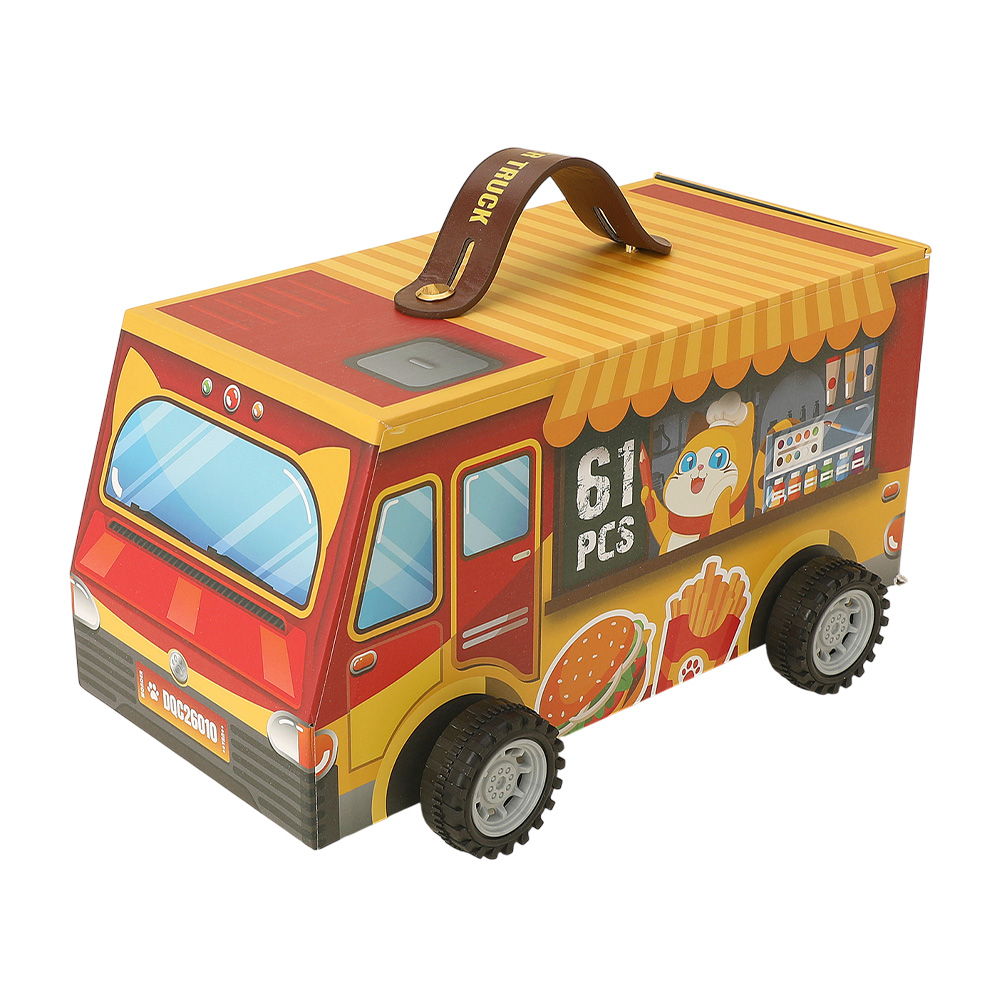 Details • Size : 10" X 5" • Top Handle Size : 1.5" L • 1 Ruler, 1 Brush, 1 Eraser, 1 Palette, 15 Stickers, 2 HB Pencils, 1 Blossom Palette, 1 Watercolor Brush, 5 Washable Markers, 1 Coloring Book, 8 Watercolor, 1 Sharpener, 6 Oil Pastels, 6 Color Pencils, 10 Paper Clips Included • Exciting 61-piece art truck set featuring markers, pencils, watercolors, stickers, and more in a fun rolling truck case. Complete with drawers for easy storage, this portable art kit encourages creativity and imagination, making it a perfect gift for young artists and craft enthusiasts.